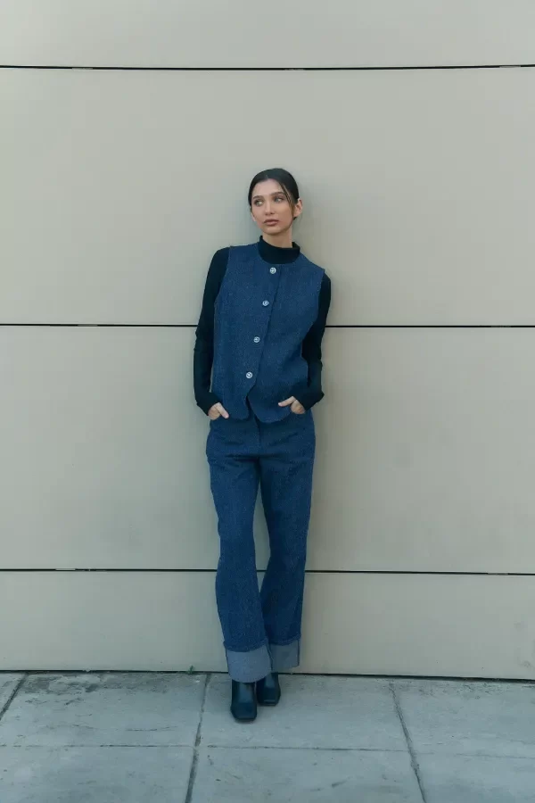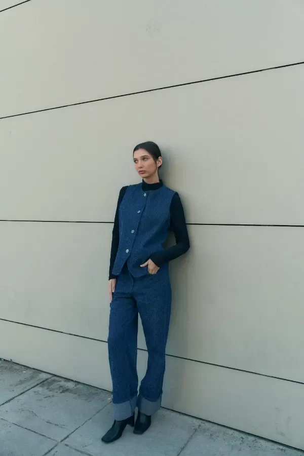 Pantalón tipo MOM ancho, tramado con dobladillo